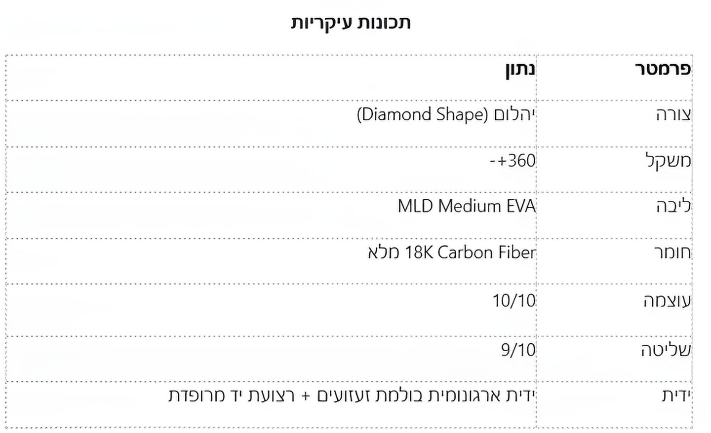 המחבט עשוי מחומרים פרימיום -18K Carbon מלא ובנוי בצורת יהלום המעניקה כוח מתפרץ ודיוק חד. הוא שוקל כ־360 גרם, מצויד בליבת MLD Medium EVA ליציבות ושליטה מאוזנת, ומשטחו כולל טקסטורה מחוספסת ליצירת ספינים חדים. ידית ארגונומית בולמת זעזועים ורצועת יד מרופדת משלימות חוויית משחק נוחה ומדויקת.
